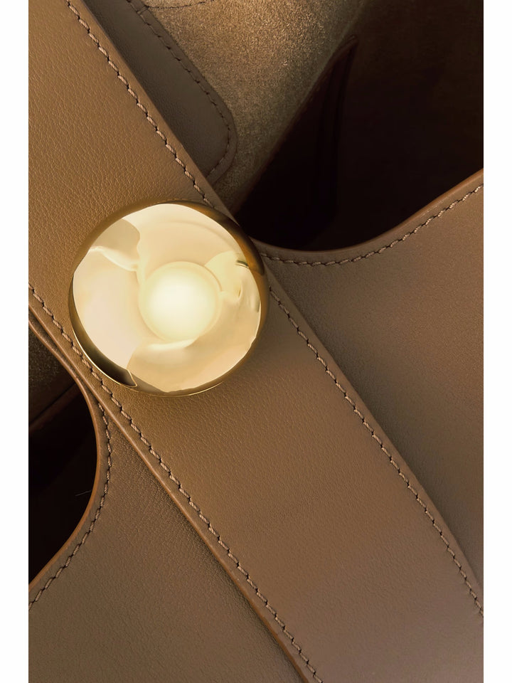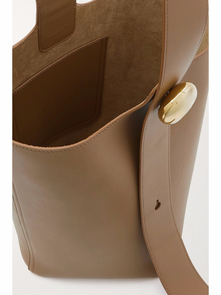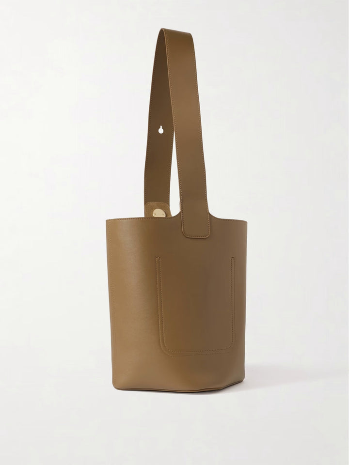‘Bucket’ çantası, deriden yapılmış, yumuşak bir kova şekline sahiptir. Ayarlanabilir askısı ve oyulmuş altın rengi donanımı vardır. İçinde cüzdanınız, güneş gözlüğünüz ve el losyonunuz için bolca yer vardır.