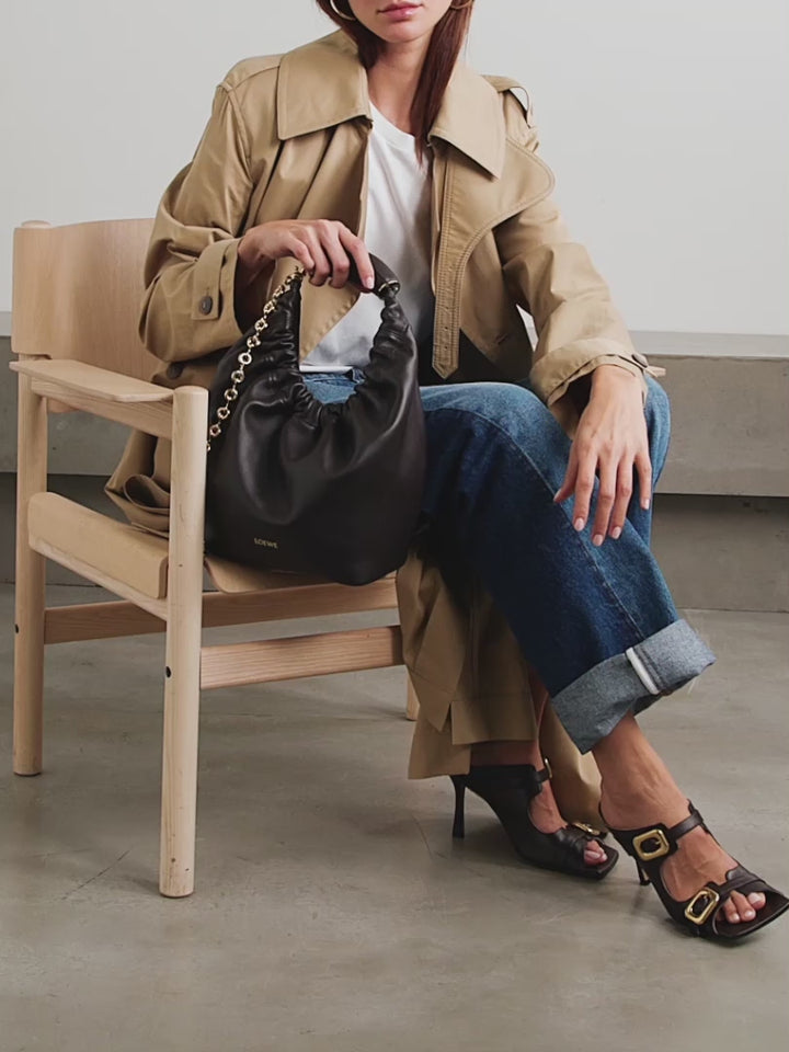 Sonbahar ‘23 defilesinde ilk kez görücüye çıkan çantalar, markanın arşivlerindeki 70'ler stilinden ilham almıştır. Yumuşacık deriden üretilen bu orta boy 'Squeeze’ modeli, üst kısmında büzgülü bir tasarıma sahiptir ve altın rengi zincirli kavisli bir sapı vardır. İçinde telefonunuz veya anahtarlarınız için fermuarlı bir cep bulunmaktadır.