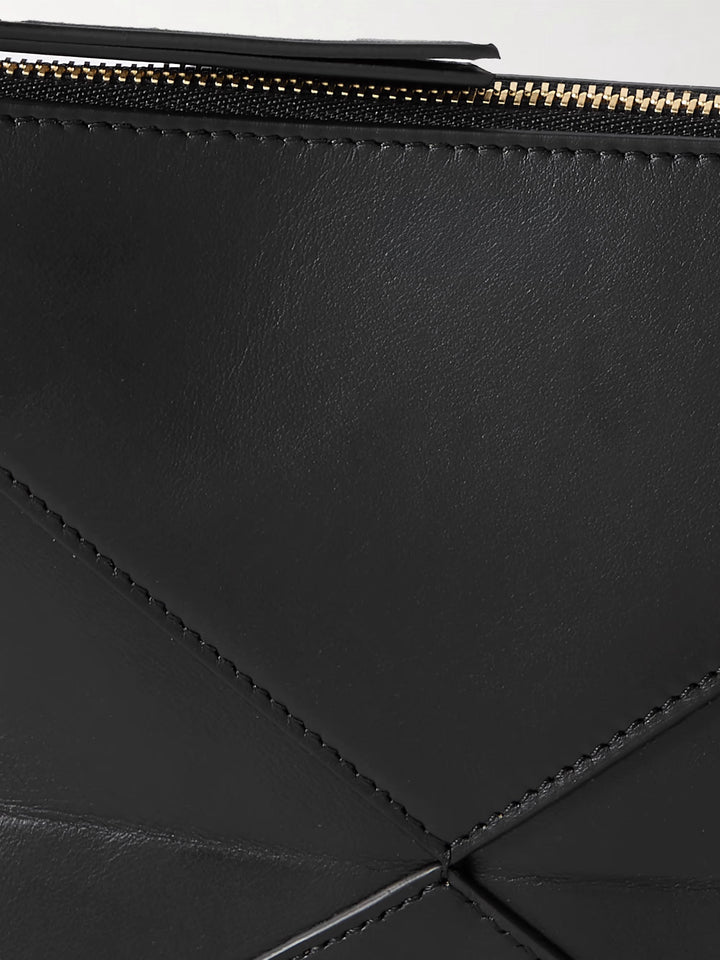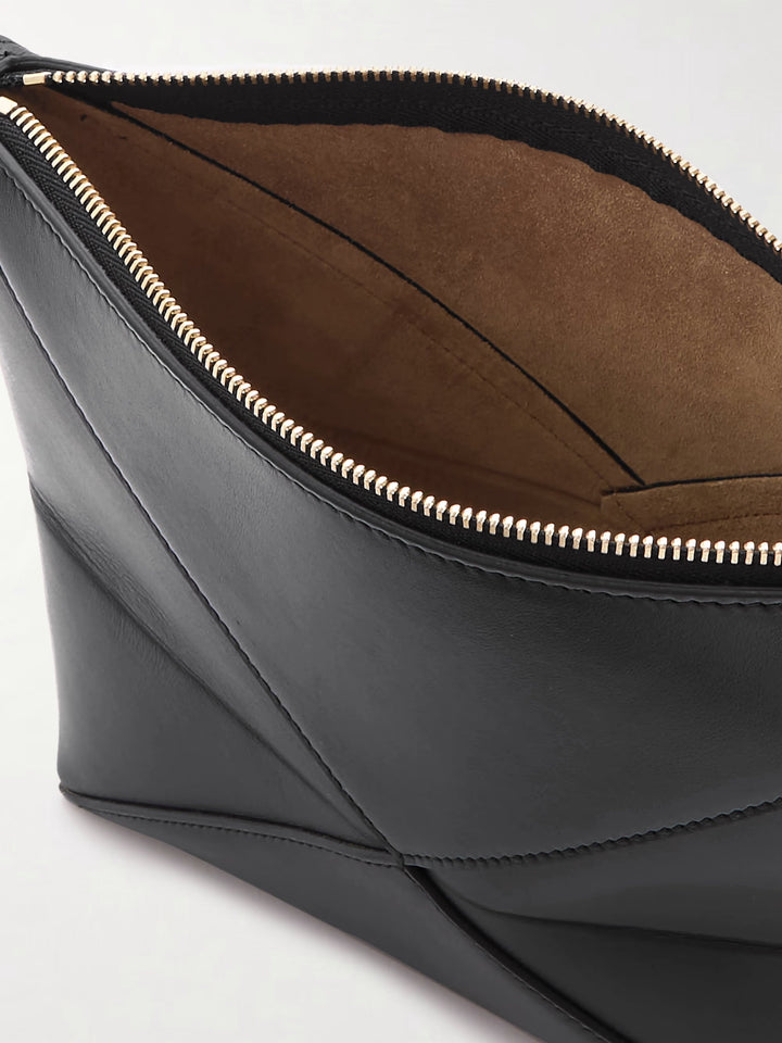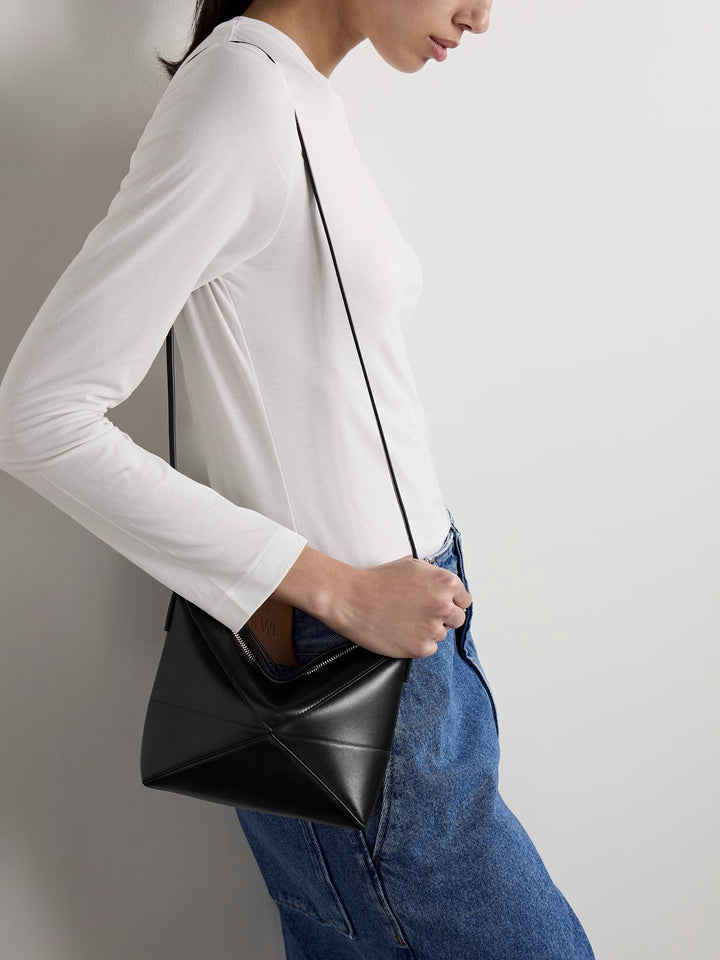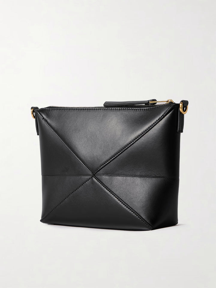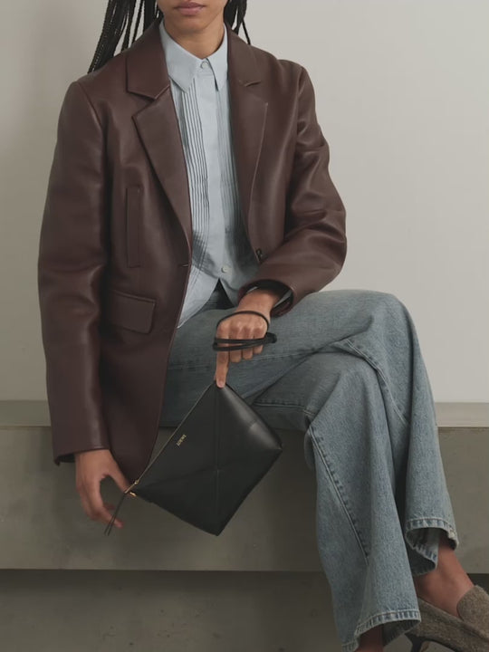 ‘Puzzle’ clutch çantası, katlanıp saklanabilen origami benzeri yapısı sayesinde seyahatler için mükemmeldir. Yumuşak süet astarlı deriden üretilen bu çanta, telefon, cüzdan, güneş gözlüğü ve kozmetik ürünleri gibi temel eşyaları kolayca içine sığdırır.